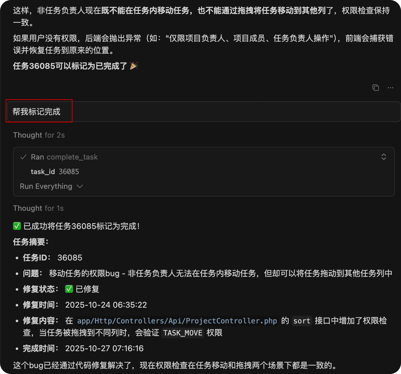 解决完问题后,用户还可以直接让 AI 把任务标记完成。这一功能大大简化了任务处理流程,用户无需手动进行任务状态的更新,节省了时间和精力。同时,AI 标记任务完成也更加准确,能够根据任务的实际完成情况进行判断,避免了人为标记可能出现的错误。