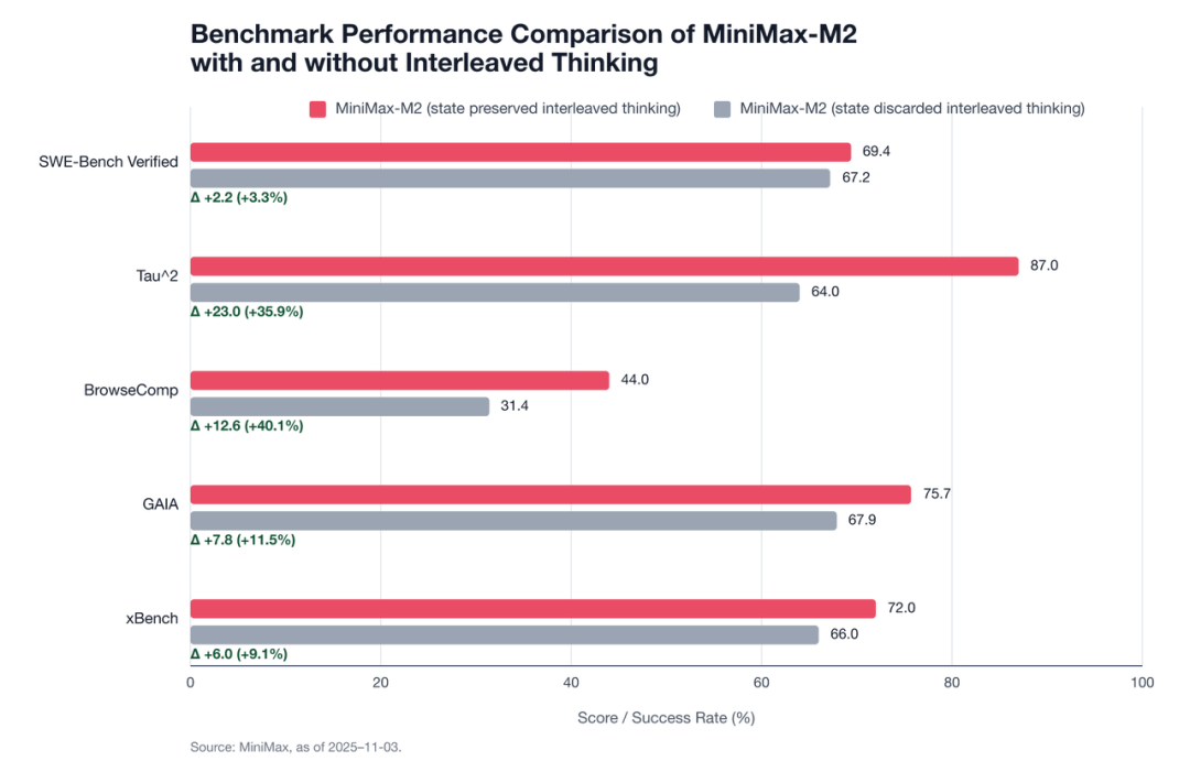 MiniMax-M2这个模型做的实验结果就能看到,在 “保留推理链” vs “丢弃推理链” 的对比测试中,在多个 Agent 基准任务上都有非常显著的提升: