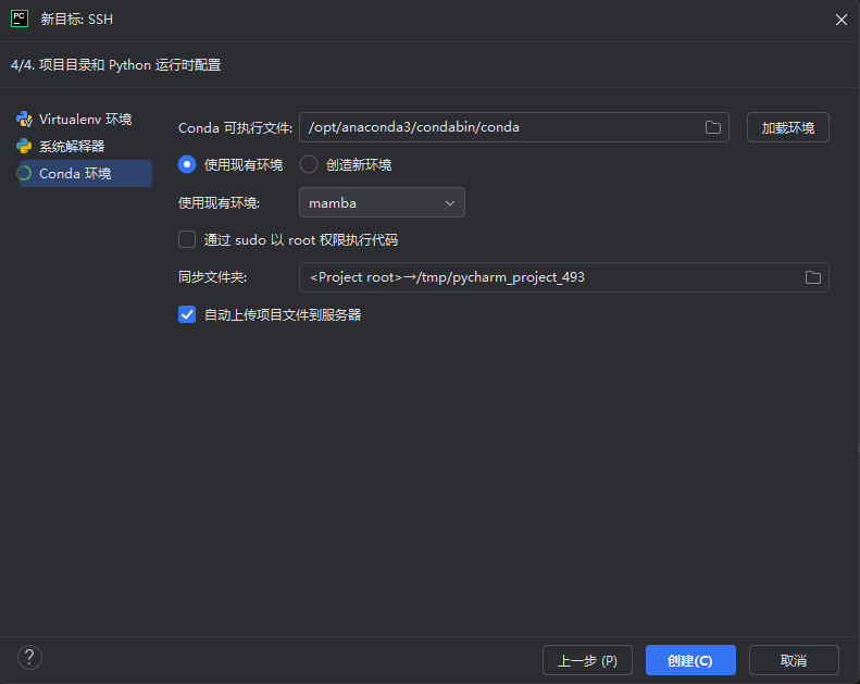 最后一步我们需要添加一个conda环境,这里可以选择已有的,也可以选择新建