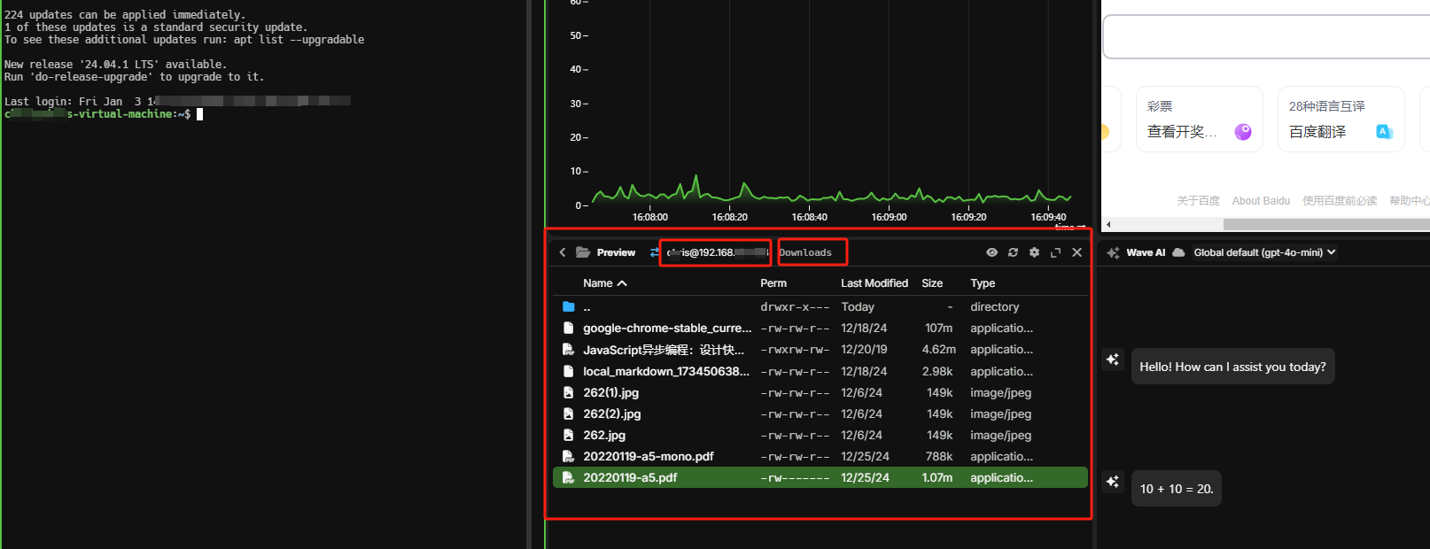 想要使用当前的 Windows 系统通过 Wave Terminal 远程 ssh 连接本地局域网内的 Linux 服务器,直接在 Terminal 中输入ssh 用户名@服务器IP,提升密码后输入即可连接。
