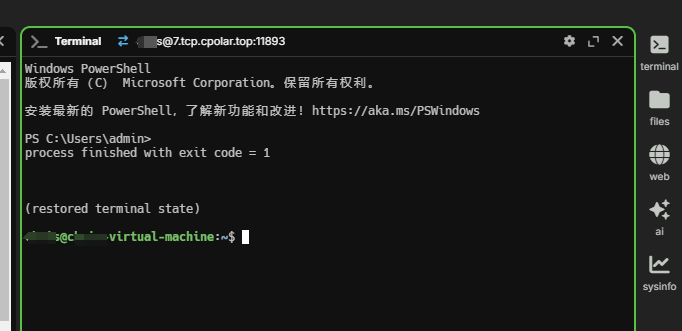 现在,我们可以回到 Windows 系统中的 Wave Terminal,在 ssh 连接本地内网中的 ubuntu 时,点击 Terminal 右侧的电脑图标后,在输入框中输入 用户名@粘贴这个使用cpolar生成的公网地址:(复制 tcp://后边的连接即可)