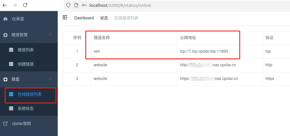 然后点击下方的在线隧道列表,可以看到 ssh 的公网地址: