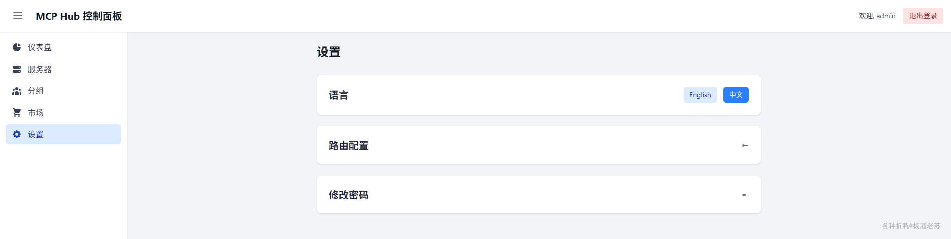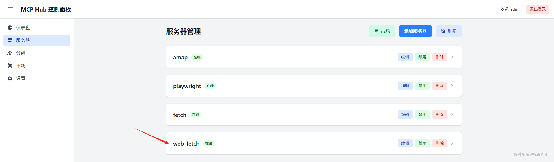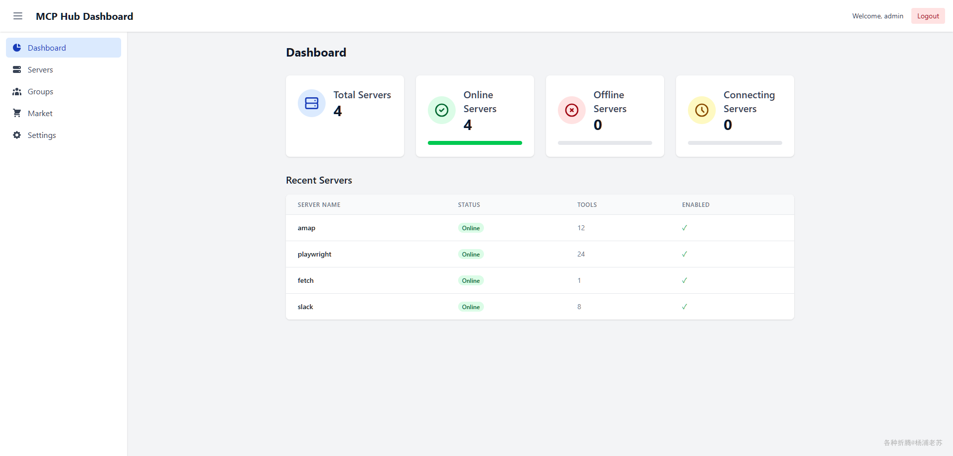 amap-maps、playwright、fetch、slack等常见服务器。 - 集中式管理控制台:在一个简洁的