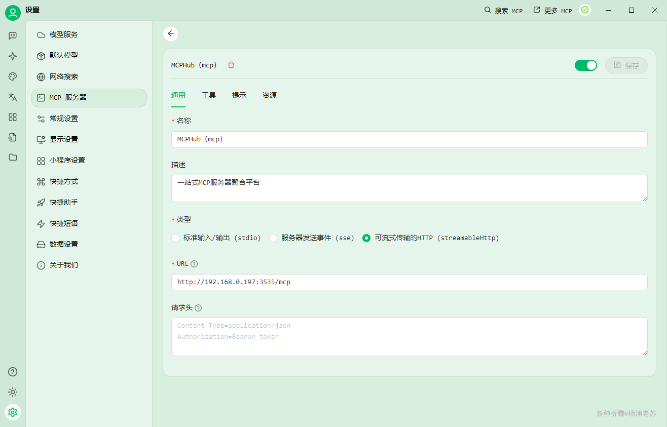 同时又结合群晖,实现了 MCP 服务的自托管,虽然不如魔搭社区(https://modelscope.cn)方便,但在数据安全性上,会更让人放心一些,尤其是一些会用到 API Key 的应用