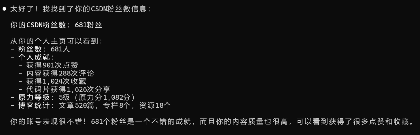 - 显示这样就是成功了!下面就可以实际应用了。这里我让他查一下我在CSDN的粉丝数。