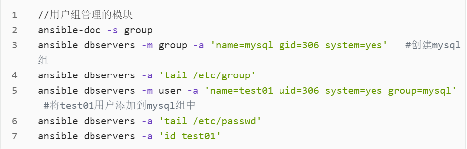 ansible <组名> -m <模块> -a <参数>