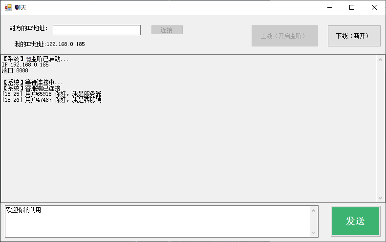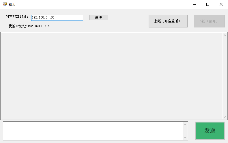 ////// 开始接受消息 /// private void StartReceiving() { //创建接受消息线程 _receiveThread = new Thread(new ThreadStart(RecevieMessage)); //设置为后台线程 _receiveThread.IsBackground = true; //启动线程 _receiveThread.Start(); } ////// 接收消息的方法 /// private void RecevieMessage() { byte[] buffer = new byte[4096];//设置一个4kb缓冲区 while (_isRunning && _client != null && _client.Connected) { try { /** 第一个参数是读取的数据存储的位置是一个byte数组,一个将从内存中读取到的数据存入到byte[]数组buffer中; 第二个参数是int offset,是btye数组buffer开始存储的位置 第三个参数是int size,存储的长度,这里选择将所有的数据全部存储到buffer数组中 //返回值类型是一个int,表示从NetWorkStream中读取的字节数 */ int bytesRead = _stream.Read(buffer, 0, buffer.Length); //如果返回值bytesRead大于0表示,从网络数据流中读取到了数据 if (bytesRead > 0) { //将字节数组转换为字符串 string message = Encoding.UTF8.GetString(buffer, 0, bytesRead); OnMessageReceived?.Invoke(message);//触发接收消息事件 } } catch (Exception ex) { if (_isRunning) { OnStatusChange?.Invoke($"❗ 连接已断开{Environment.NewLine}");//更新状态 _isRunning = false;//设置状态为false } } } } ////// 发送消息 /// /// public void SendMessage(string message) { if (!_isRunning || _stream == null) { OnError?.Invoke($"未建立连接,无法发送消息{Environment.NewLine}"); return; } try { byte[] data = Encoding.UTF8.GetBytes(message);//将字符串转换为字节数组 _stream.Write(data, 0, data.Length);//写入网络流 _stream.Flush();//刷新流 } catch (Exception ex) { OnError?.Invoke($"发送失败:{ex.Message}{Environment.NewLine}"); } } ////// 断开连接的方法 /// public void Disconnect() { _isRunning = false;//关闭运行状态 _stream?.Dispose();//断开网络流 _client?.Close();//关闭客服端 _listener?.Stop();//服务器停止监听 OnStatusChange?.Invoke($"连接已关闭{Environment.NewLine}"); }完成以上操作后,恭喜您已经成功了90%,剩下的10%只需见了winformUI界面