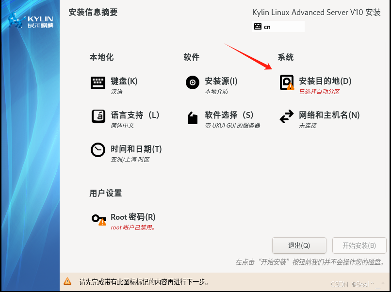 - 安装目的地:选择安装的目的地,可以选择自动分区或手动分区。建议为系统分区和数据分区单独设置。