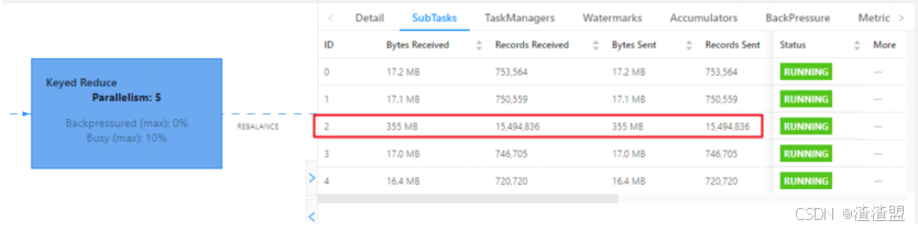 相同 Task 的多个 Subtask 中,个别 Subtask 接收到的数据量明显大于其他Subtask 接收到的数据量,通过 Flink Web UI 可以精确地看到每个 Subtask 处理了多少数据,即可判断出 Flink 任务是否存在数据倾斜。通常,数据倾斜也会引起反压。