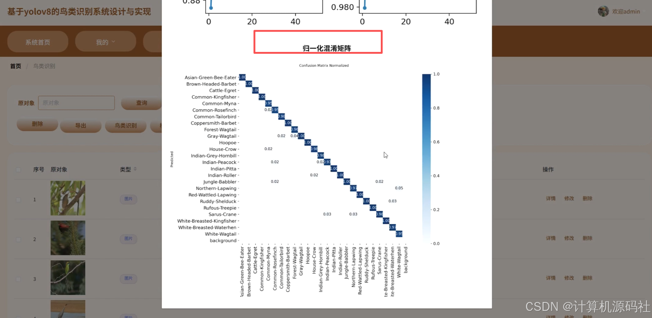 系统开发工作涵盖前端交互层、后端服务层与算法模型层的协同设计与实现。前端界面采用现代化Web技术栈开发,实现响应式布局,核心功能包括导航菜单(系统首页、鸟类识别、个人中心)、智能识别弹窗(支持图片识别与视频识别模式切换)、拖拽上传区域、识别结果可视化展示(置信度条形图、候选类别标签)以及鸟类详情信息卡片(展示物种形态特征、分布范围、保护级别等图文信息)。后端服务基于Python生态构建,集成YOLOv8推理引擎,实现图像预处理、批量推理、结果解析与数据持久化,提供RESTful API支持识别记录的增删改查、分页查询与批量导出。模型训练模块支持自定义数据集上传与参数配置,通过训练图表展示损失曲线与性能指标。数据库设计存储用户上传记录、识别结果、鸟类百科知识库与模型配置参数。系统还实现了基于混淆矩阵的模型性能评估可视化功能,直观展示各类鸟种的识别准确率与误分类情况,形成涵盖数据采集、模型训练、推理应用到结果管理的完整技术体系。