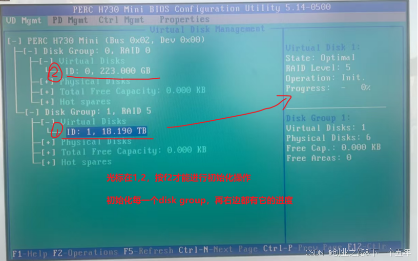 - 在 RAID 配置主界面,按 F2 键,从弹出的菜单中选择“Create New VD”(创建新虚拟磁盘),按 Enter 键。