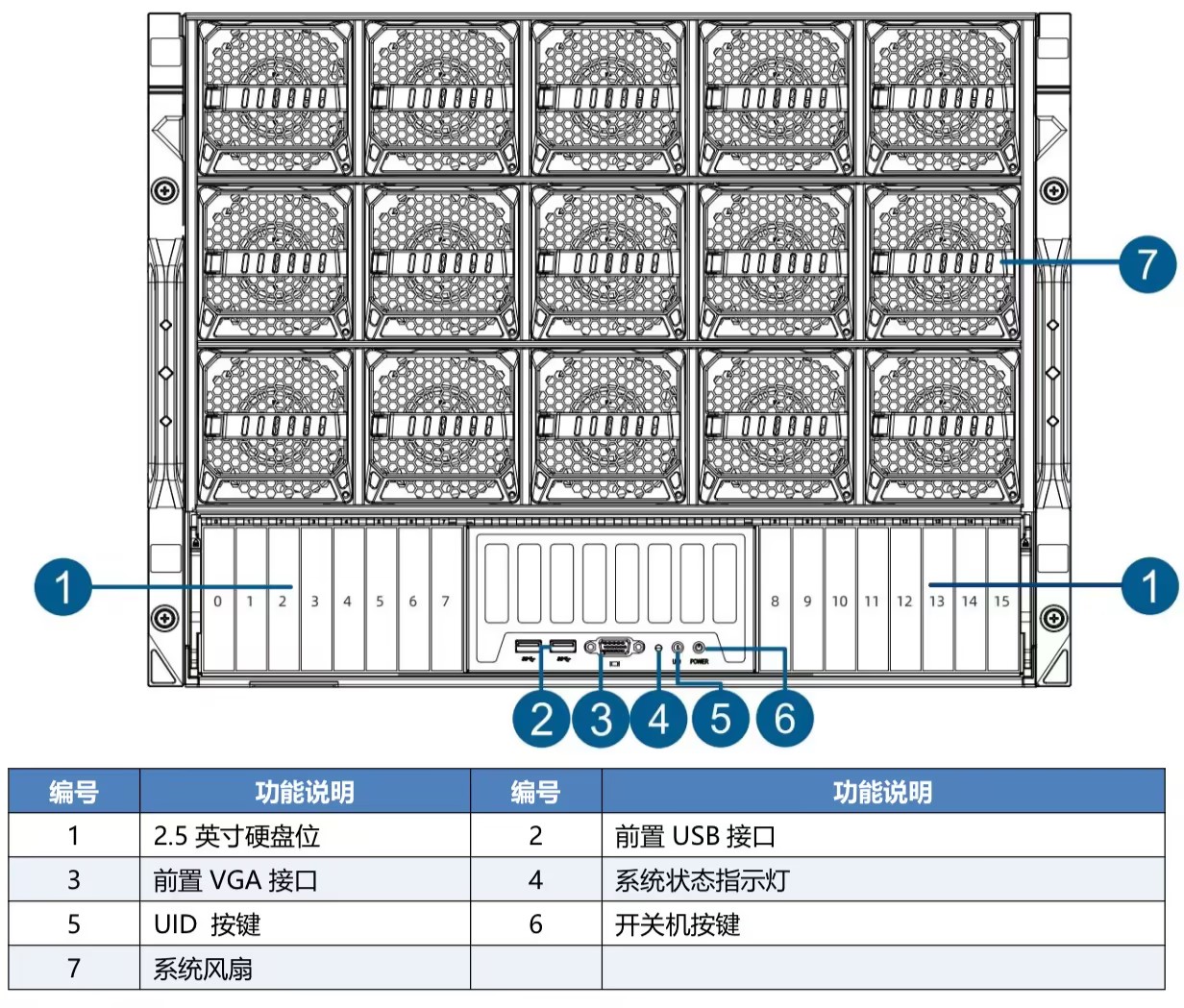 - 前部区域(存储与风扇接口):通常配备NVMe存储背板,支持热插拔NVMe SSD,提供高速本地存储。同时,作为系统的主要进风口,也为中部散热风墙提供冷空气通道。