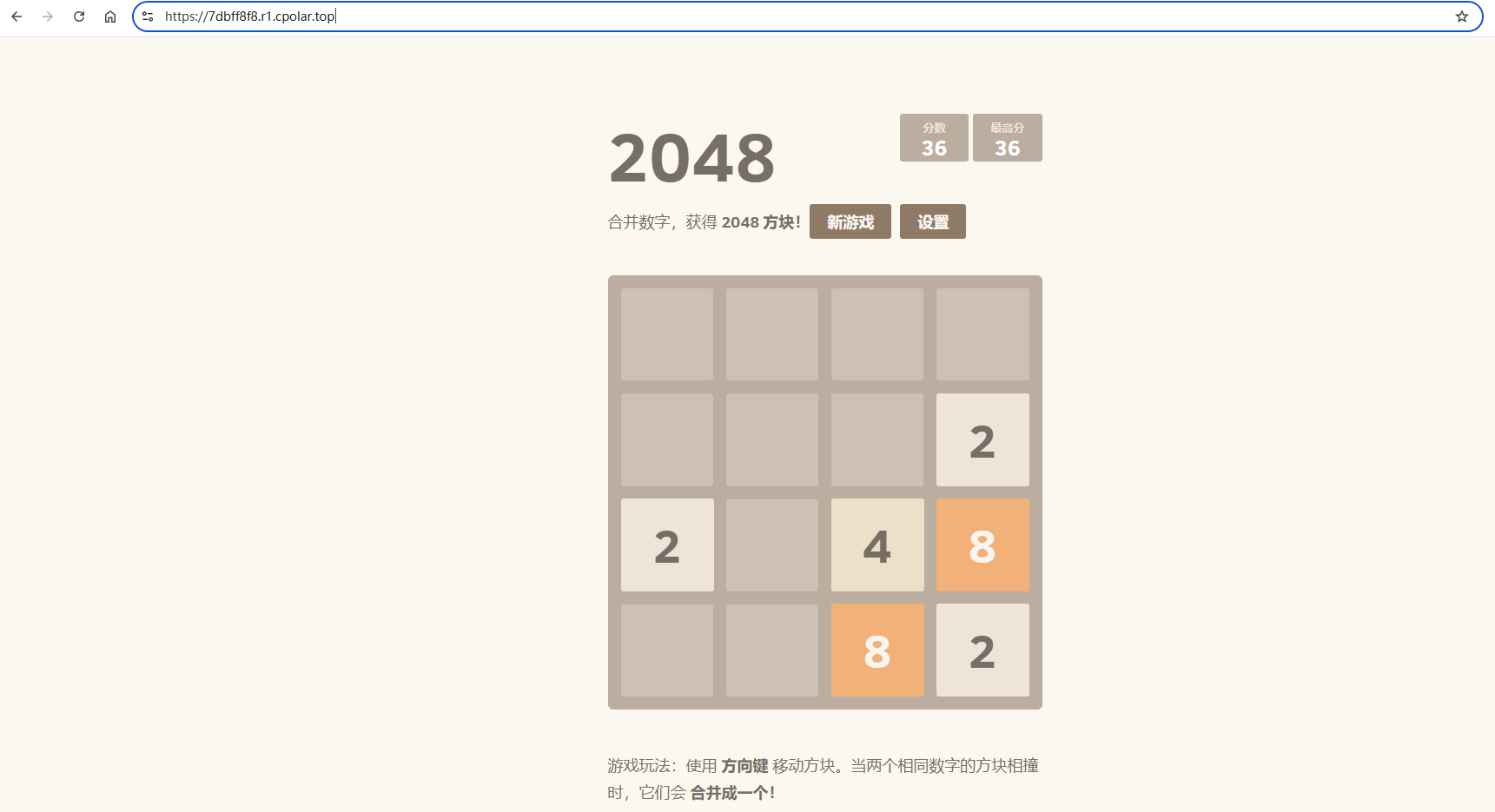 由于前面设置的【Nginx】监听端口是8080,所以需要使用【盒子IP+8080端口】进行访问2048小游戏页面: