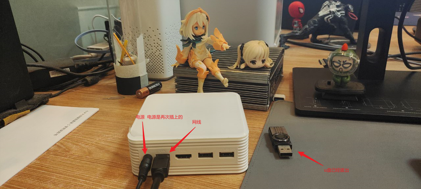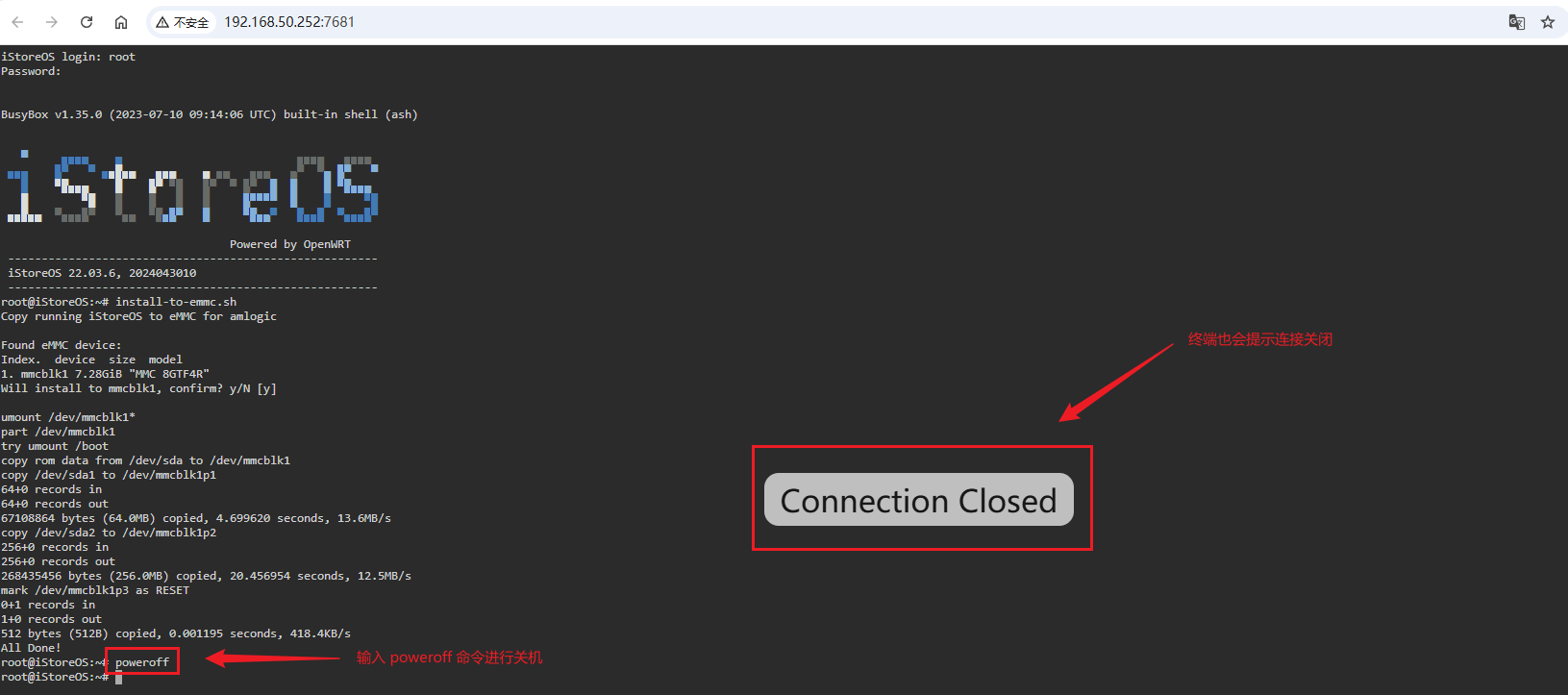 Linux系统互刷: 基于Linux的系统之间可以相互刷入,通过烧录镜像写入U盘,然后U盘启动系统,并将系统写入eMMC存储中。在开始编写本教程前,已经成功从CasaOS系统刷入到了iStoreOS系统:
