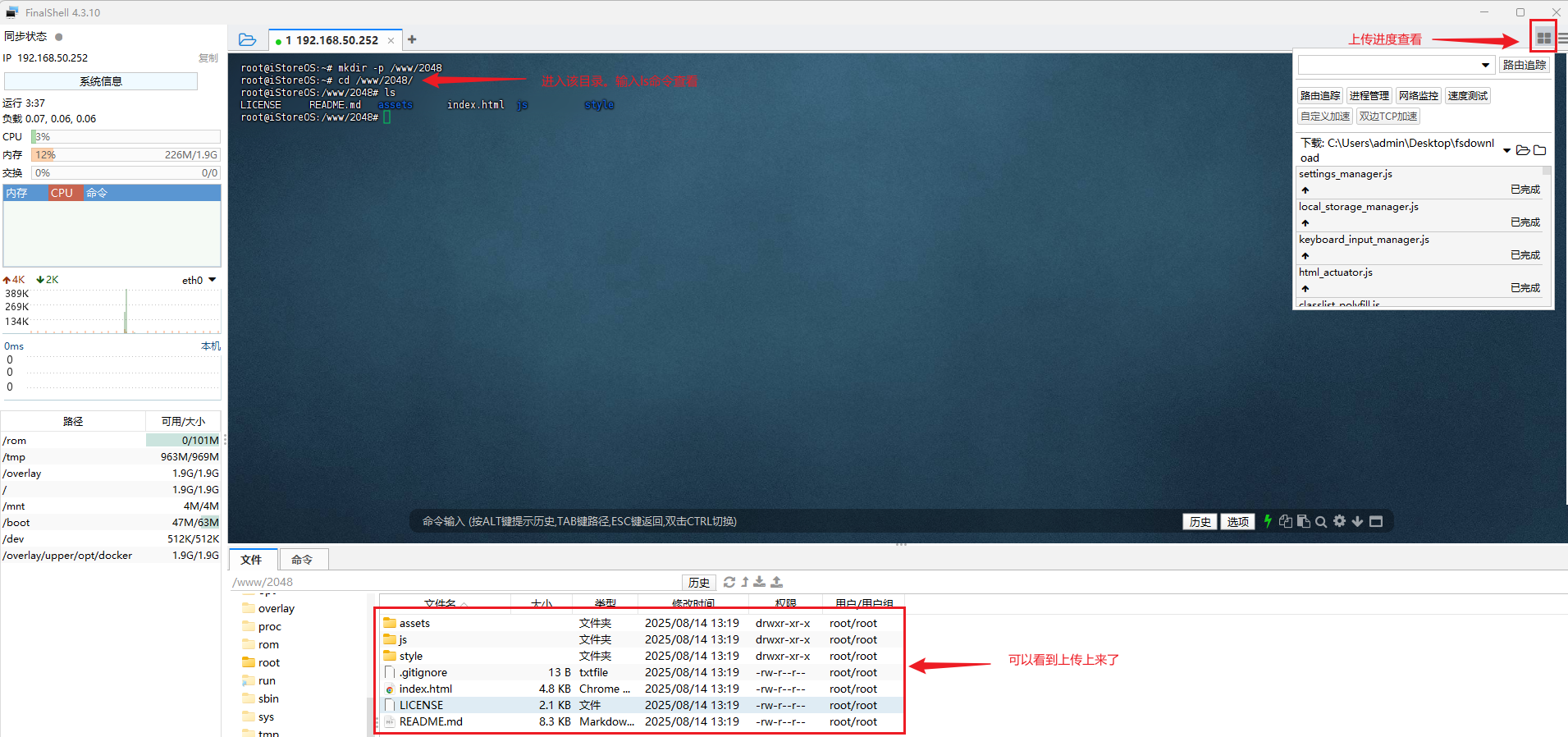 接着打开电脑上的2048小游戏源码目录,把全面内容复制拖动到finalshell 该窗口位置: