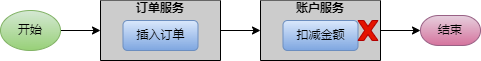 事务失效是造成数据不一致的一种常见情况。举一个例子,客户下订单后,订单表插入一条记录,插入成功,账户表扣减金额,但扣减金额失败。如下图: