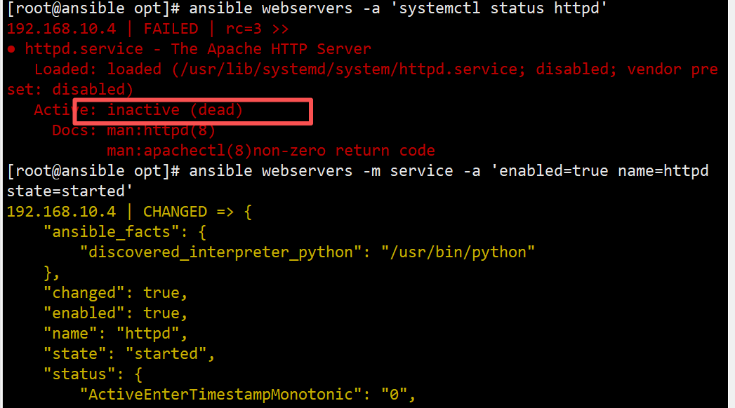 ansible webservers -a 'systemctl status httpd' #查看web服务器httpd运行状态