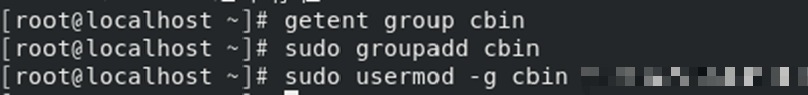 可以通过getent group cbin查看是否有cbin用户组,可以看到没有返回值,即可确认没有cbin。接着就可以使用sudo groupadd cbin创建一个用户组,再使用sudo usermod -g cbin ###123命令将用户修改到cbin用户组。