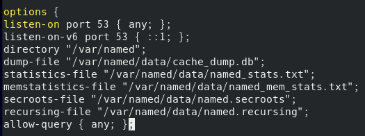 接下来就是修改这三个文件。首先使用vim /etc/named.conf修改主配置文件。这里可以看到将listen-on port 53修改为any;,allow-query修改为any;。