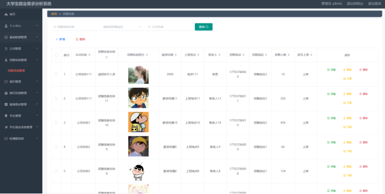 此页面让管理员管理学生就业信息的数据,学生就业信息管理页面见下图。此页面主要实现学生就业信息的增加、修改、删除、查看的功能。