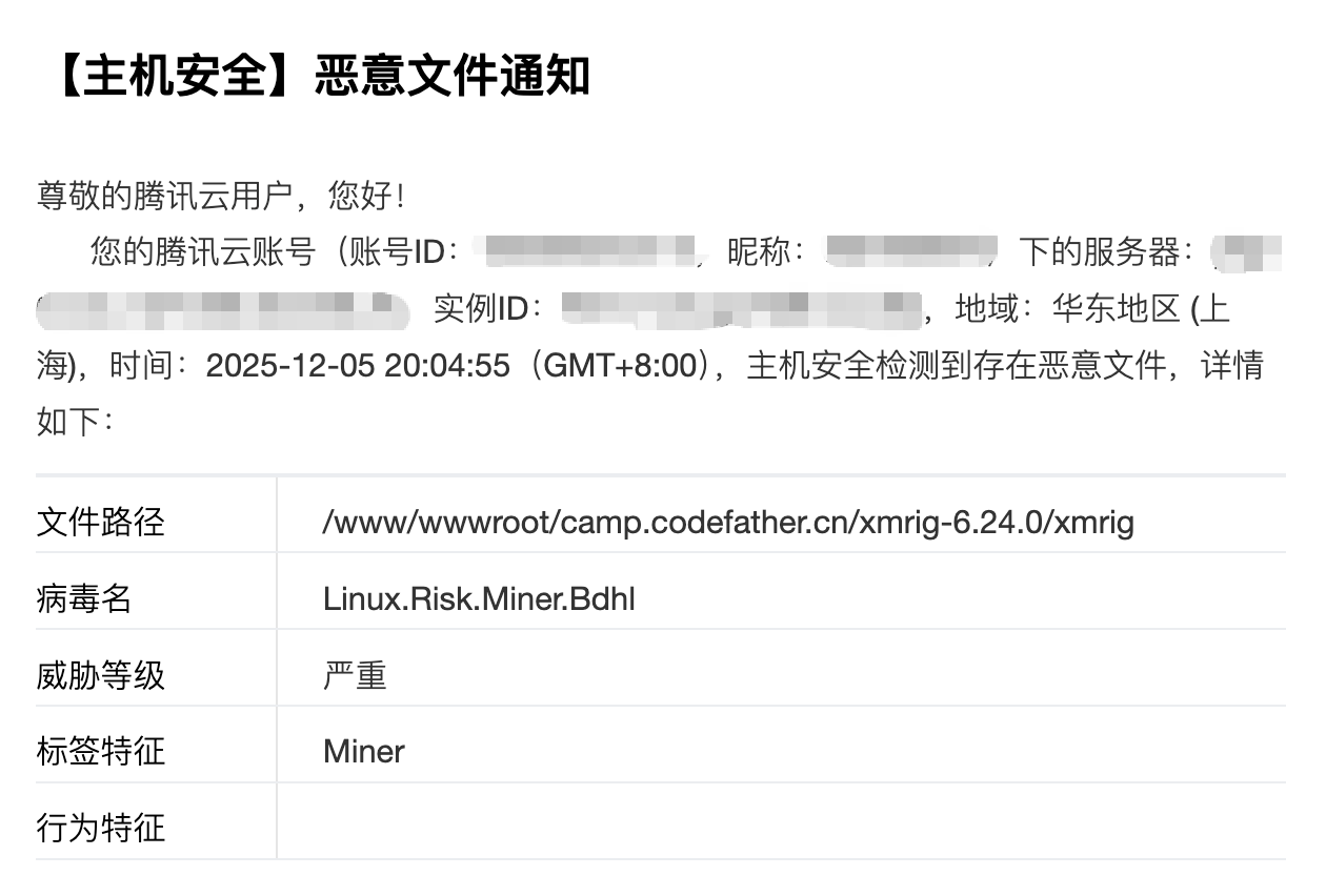 然后在当晚,腾讯云就给我发了第二条通知,说是我的服务器上检测到存在恶意文件,显然是一个挖矿程序。