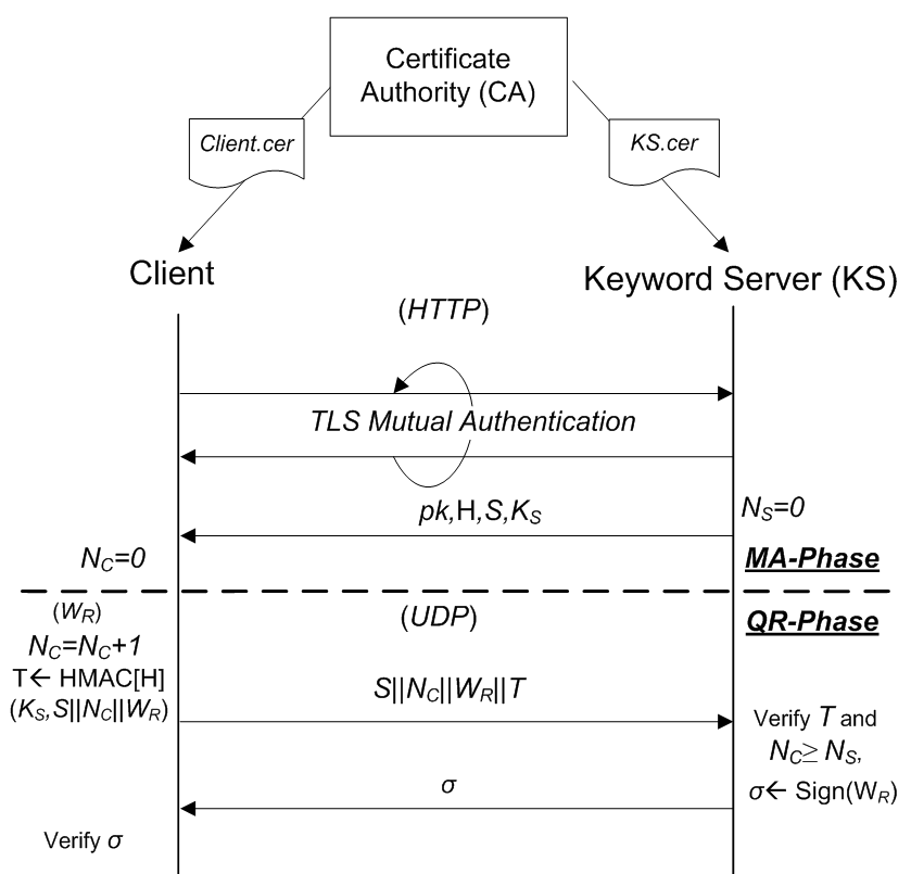 受[20],工作的启发,我们提出了一种用于客户端与密钥服 务器(KS)交互的协议及限速策略,以限制客户端查询,减 缓在线关键词猜测攻击。我们的设计目标是提供一种低延迟 协议,避免性能下降。该协议依赖于证书颁发机构(CA), 为密钥服务器和每个客户端提供唯一的可验证TLS证书。如 图4所示,协议的执行包括通过HTTP进行的相互认证( MA)阶段和通过UDP进行的查询‐响应(QR)阶段。