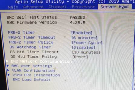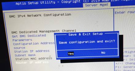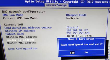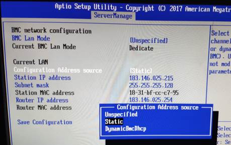 4、BMC Network Configuration配置项中的 Configuration Address source 选择Static (手动配置)然后进行配置服务器地址。