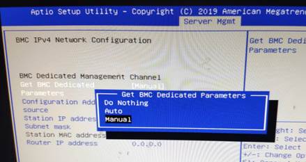3、BMC Network Configuration配置项中的Get BMC Dedicated Parameters选择Manual(手动配置)