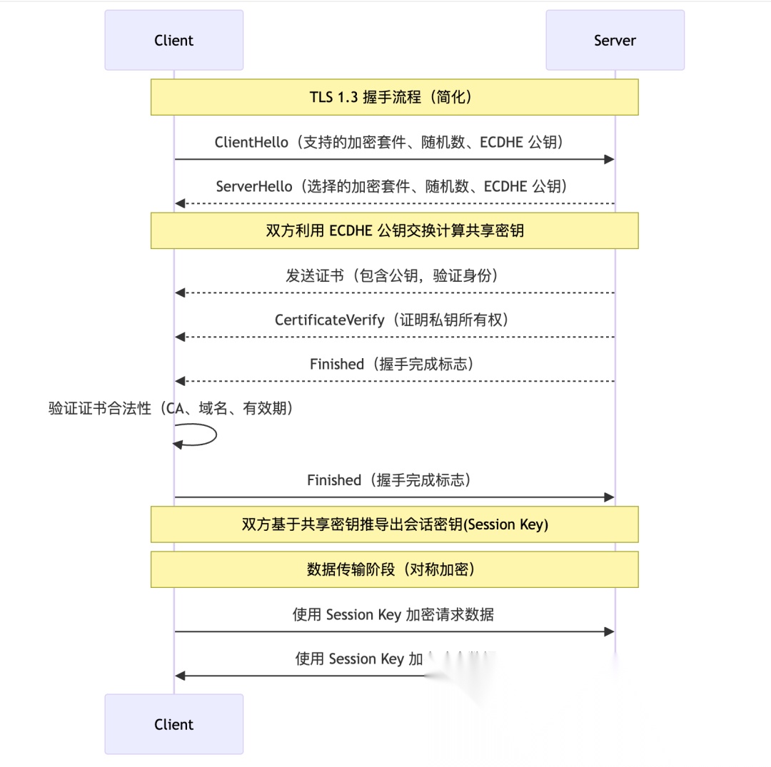 - • 🔑 不再直接用 RSA 公钥加密 Session Key,而是通过 ECDHE(椭圆曲线 Diffie-Hellman) 协商共享密钥。