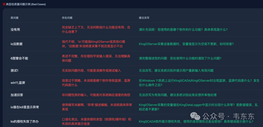 很多问题一句话问好几件事,或者问得太笼统。比如"KingView 怎么配置通讯,另外上次那个报错解决了没",这其实是两个问题。还有人问"系统老是报错怎么办",但不说是什么错、什么场景、什么版本,系统根本没法回答。不做意图拆分和澄清引导,系统要么胡乱回答一通,要么只回答了其中一个问题。这部分的优化思路是加一层意图识别,如果检测到多意图或者意图不清晰,就主动追问让用户补充信息。