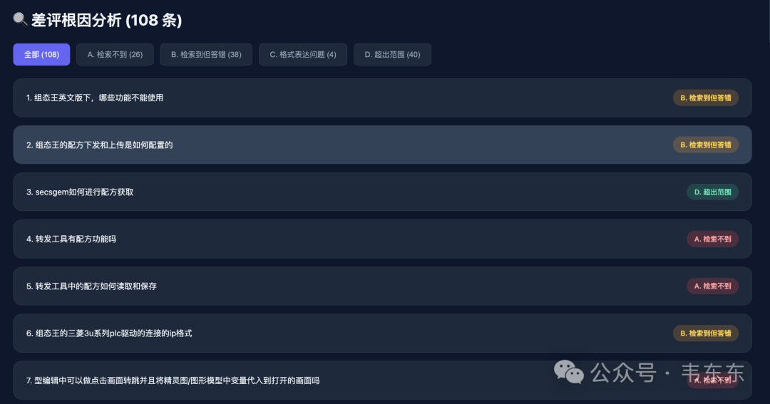 这里有个选择,是让业务专家人工标注,还是用大模型辅助?实际操作中我选择了后者。原因很简单,POC 阶段业务专家时间或者配合力度有限,让他们逐条看 108 条差评不太现实;而且差评记录里往往已经有用户的评论理由(比如"答非所问"、"根本没找到相关文档"),大模型可以结合 query + response + 召回文档 + 用户评论综合判断,效果不比人工差。跑一遍分析只需要调几十次 API,成本也就几块钱,最后人工抽检验证即可。