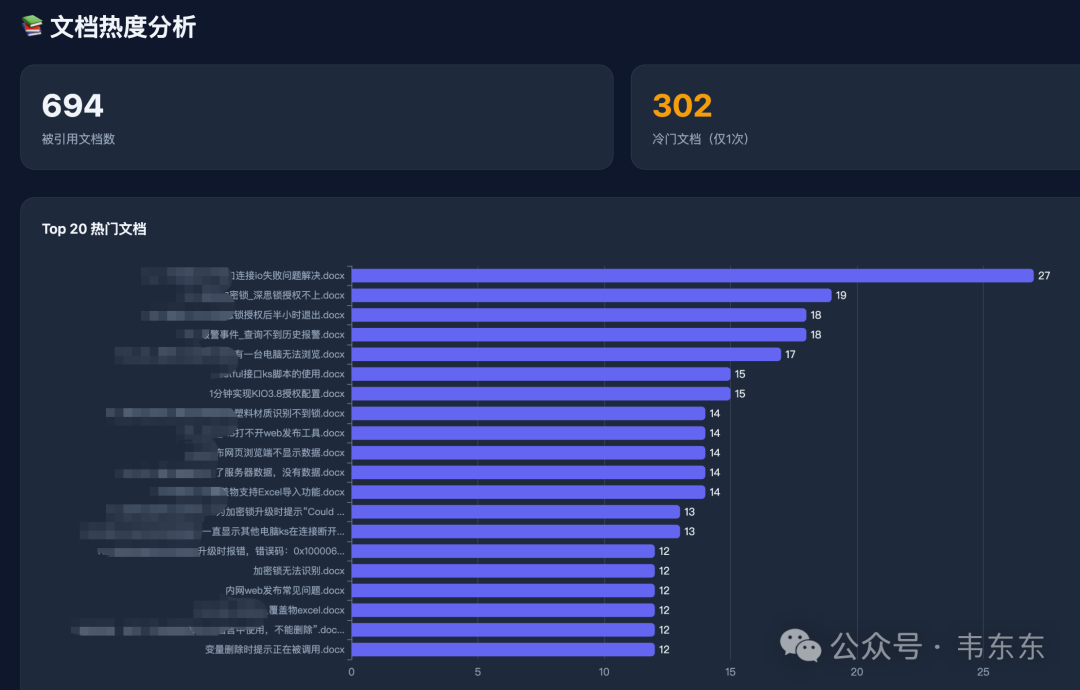 虽然客户提供了 1600 份文档,但统计下来,80% 的提问集中在其中 50 份文档上(这里的"集中"是按被召回/被引用的文档频次统计的)。这又是一个典型的二八法则。这个发现对二期的优化策略有很大指导意义。与其对 1600 份文档都做精细化切分(工作量巨大),不如先集中精力把这 50 份热点文档的切分策略、元数据标注、QA 对补充都做到位。等这部分效果稳定了,再逐步扩展到其他文档。这种"先攻高频、再扩长尾"的策略,在很多项目里实测对于效果提升的性价比都比较高。