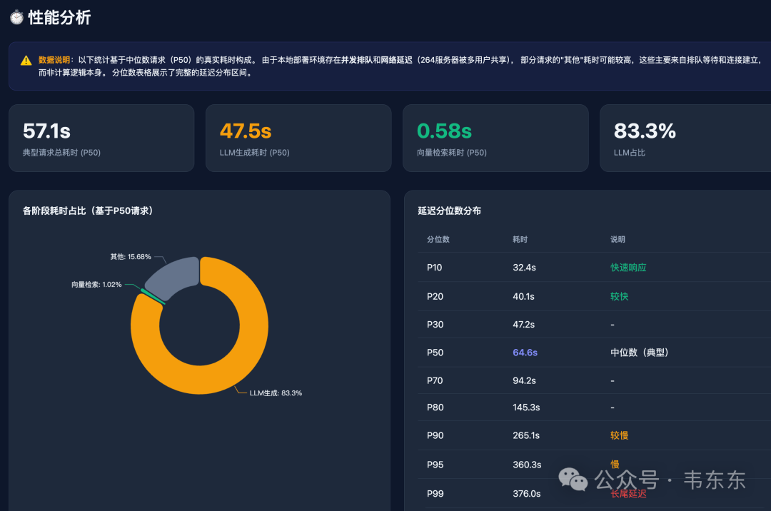 虽然这类需求并不是一个对响应延迟要求很高的场景,但性能也是大部分客户会关注的焦点。脚本最初拉出的 P50 耗时高达 57 秒,深入分析日志后,发现这其实是统计口径和异常数据造成的误导。真实的推理首字延迟在 3-5 秒 左右,受限于 Mac Mini 的内存带宽,确实需要几秒钟的预处理时间,这属于物理硬件的限制。