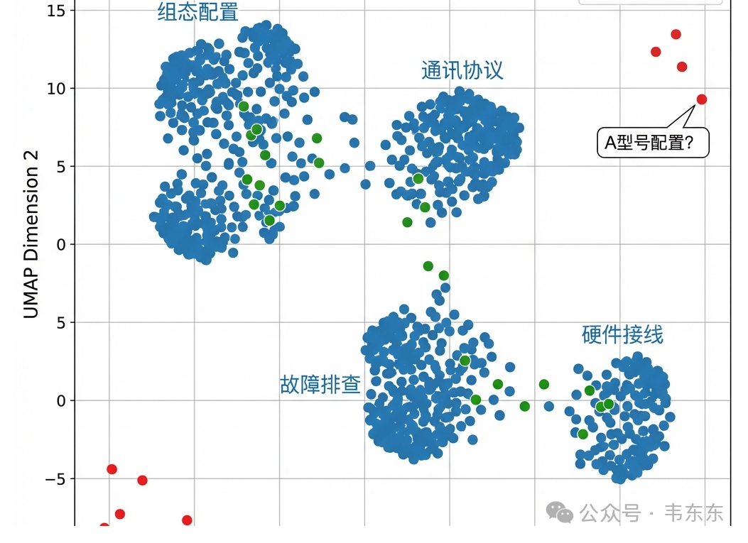举例来说,上图中的蓝色点是知识库文档的向量,聚成几个簇,分别对应"组态配置""通讯协议""故障排查"等主题;绿色是正常问题,落在簇里面或附近;红色是超纲问题,明显落在远离所有簇的无人区。做到这一步大部分客户基本就一看就 get 了。当然,降维会丢失高维空间的信息,这类图示更多是帮助客户直观理解用的,严谨的验证还是得靠上面的三级方法。