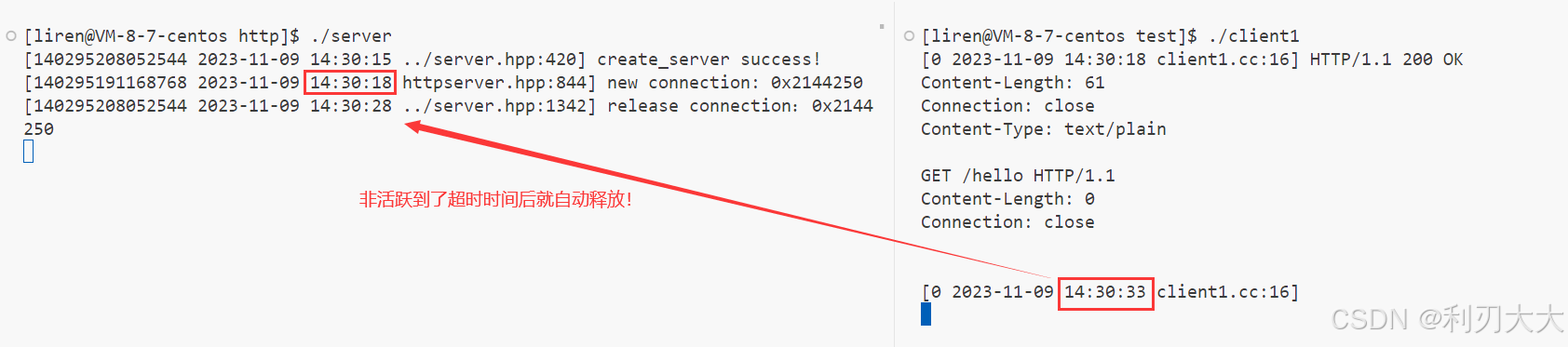 不过这种测试是比较偶然的,不一定能测出来,下面我们就创建多个子进程客户端,向服务器发送数据,然后服务器在处理 hello 执行函数中进行 15s 的等待,此时就会超过非活跃连接销毁时间!