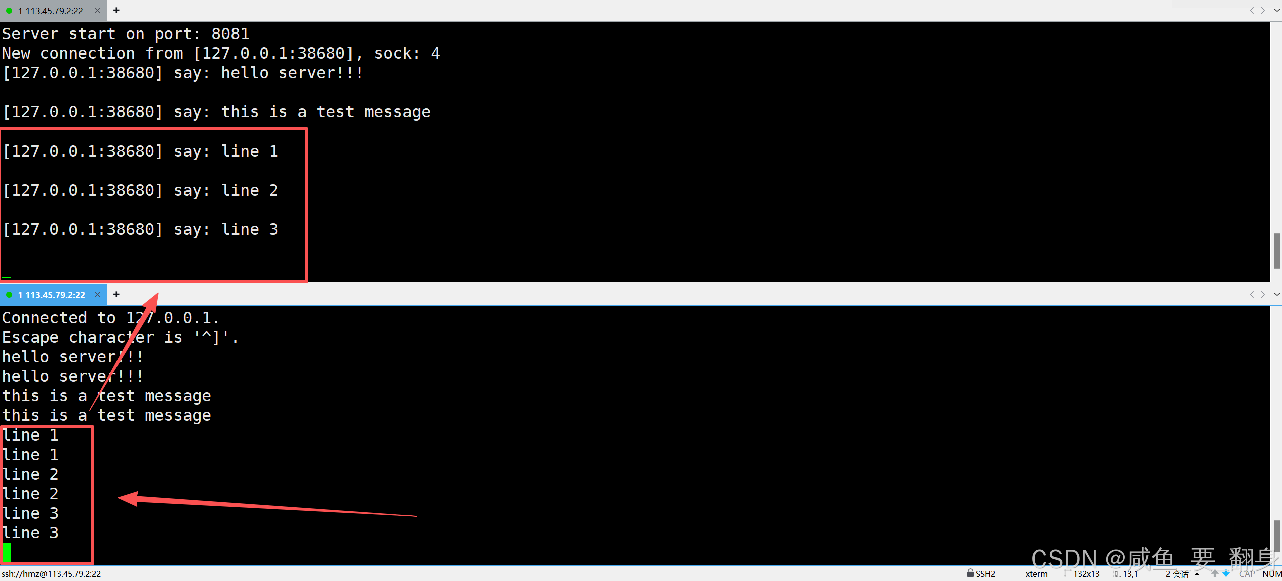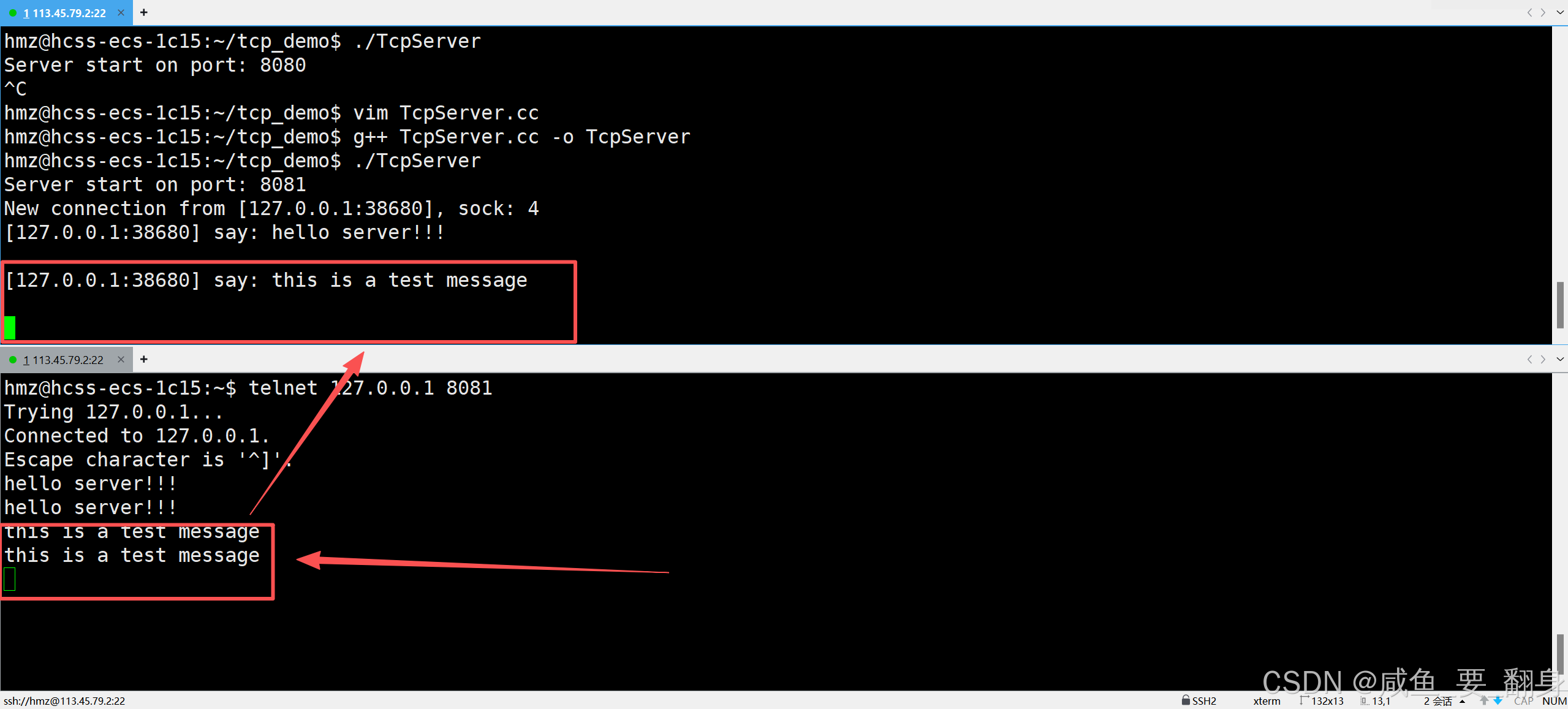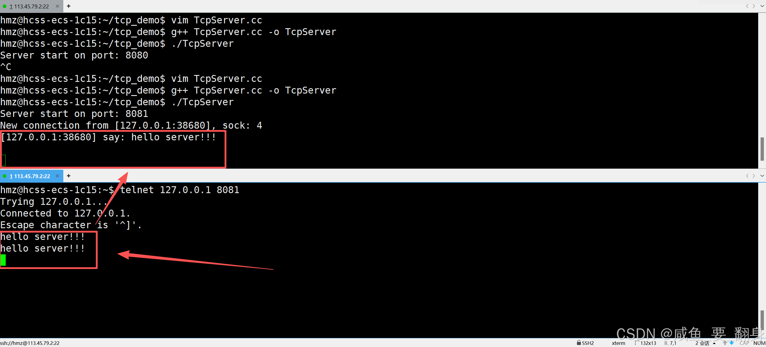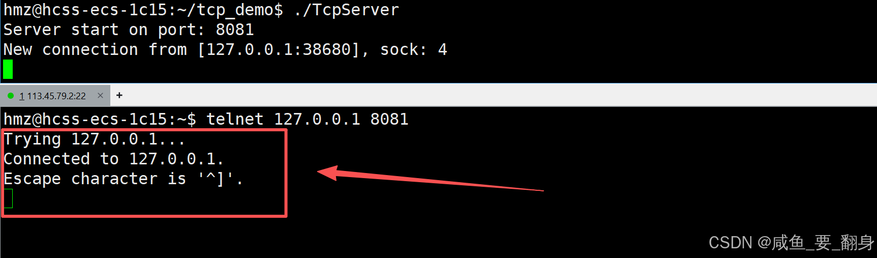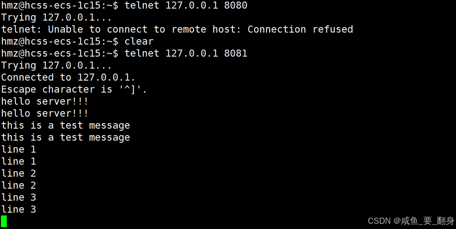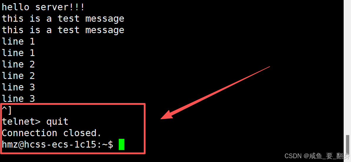 在telnet中输入:hello server!!! 你应该看到:hello server!!!
