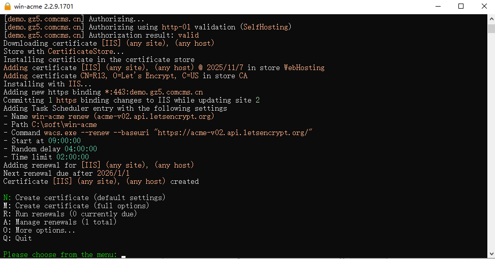经过研究,win-acme,这款工具非常适合,可以做到自动申请,并安装配置到IIS。并简单的添加一个任务即可自动续签,非常推荐大家使用。