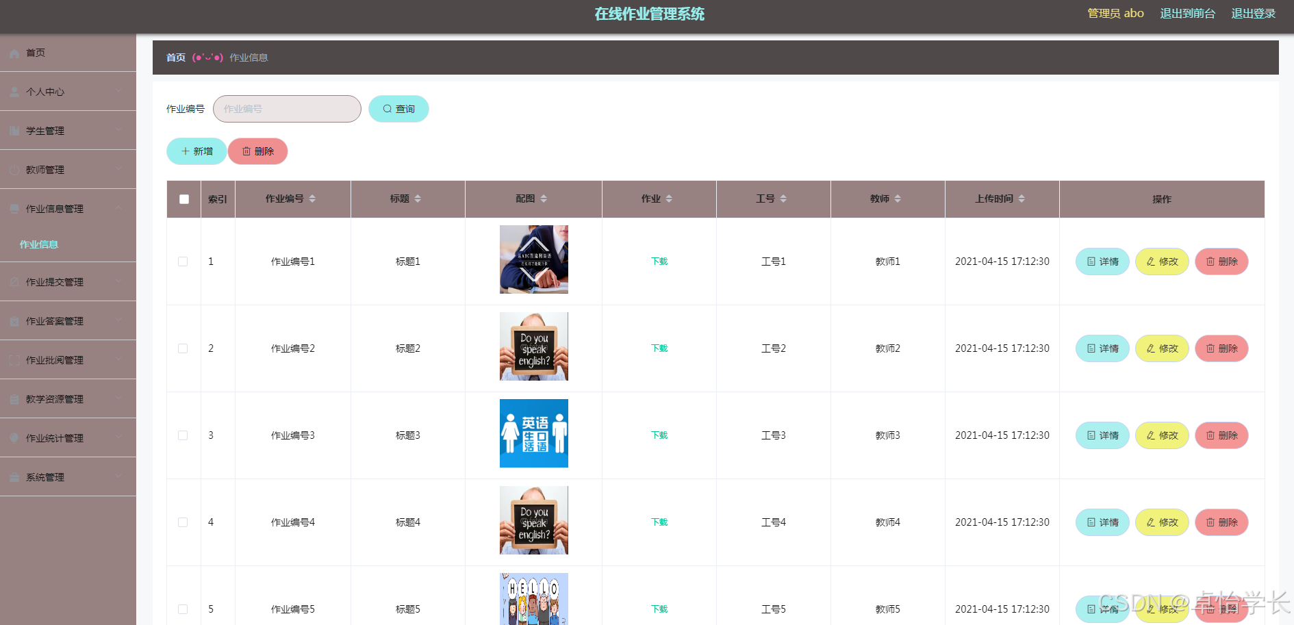 在线作业管理系统是在MySQL中建立数据表保存信息,运用SSM框架和Java语言编写。并按照软件设计开发流程进行设计实现。系统具备友好性且功能完善。本系统实现了作业管理,作业答案管理,作业批阅管理,教学资源管理,作业提交管理以及作业统计等功能。