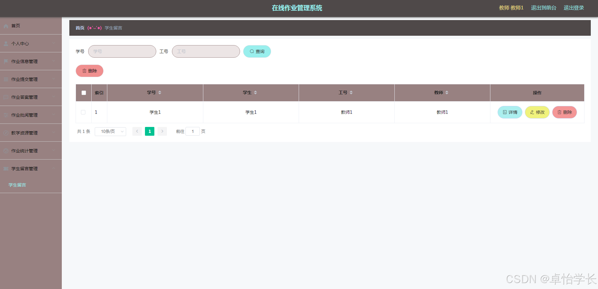 设计的教师的详细功能见下图,教师回复学生留言,新增作业和教学资源,管理作业提交,作业答案以及作业批阅信息。