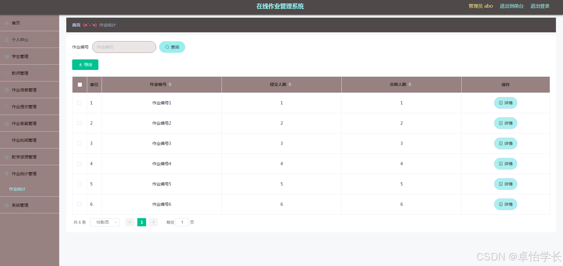 设计的管理员的详细功能见下图,管理员登录进入本人后台之后,管理作业,作业答案,作业批阅,统计作业信息,管理教师和学生。