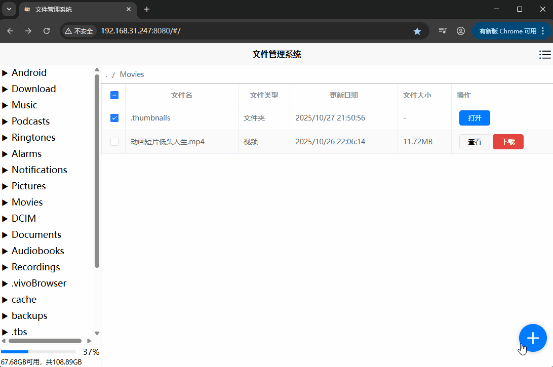 点击打开浏览器按钮,就会打开系统自带的浏览器,直接访问文件管理服务器的H5页面,