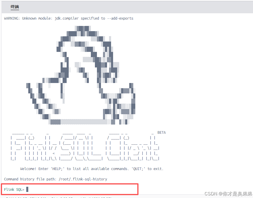 这条命令会关闭 SQL 客户端,并返回到容器内的命令行(你之前看到的 root@jobmanager:/opt/flink#)