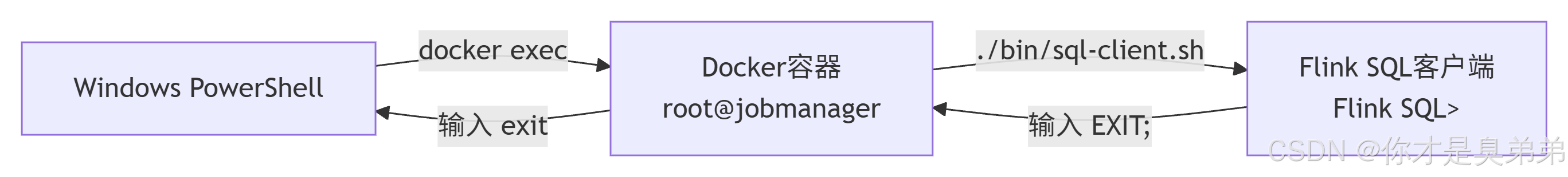 -- 退出SQL客户端后,你仍处于 jobmanager 容器的内部。要完全返回到 Windows PowerShell,在容器内的命令行输入如下