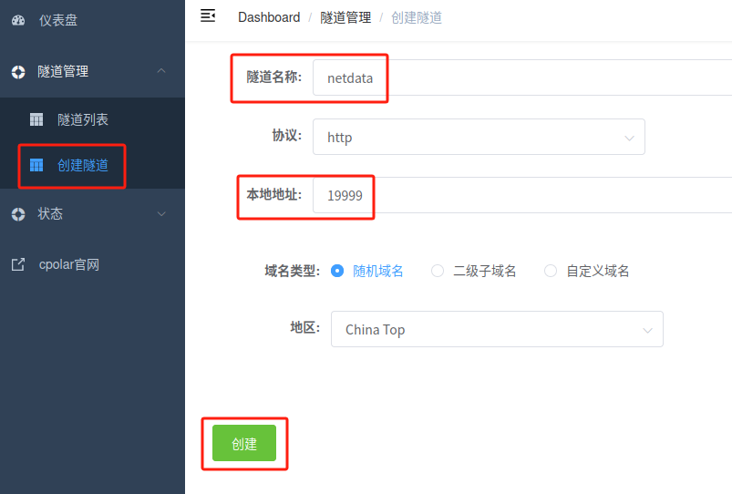 隧道名称:可自定义,本例使用了: Netdata,注意不要与已有的隧道名称重复