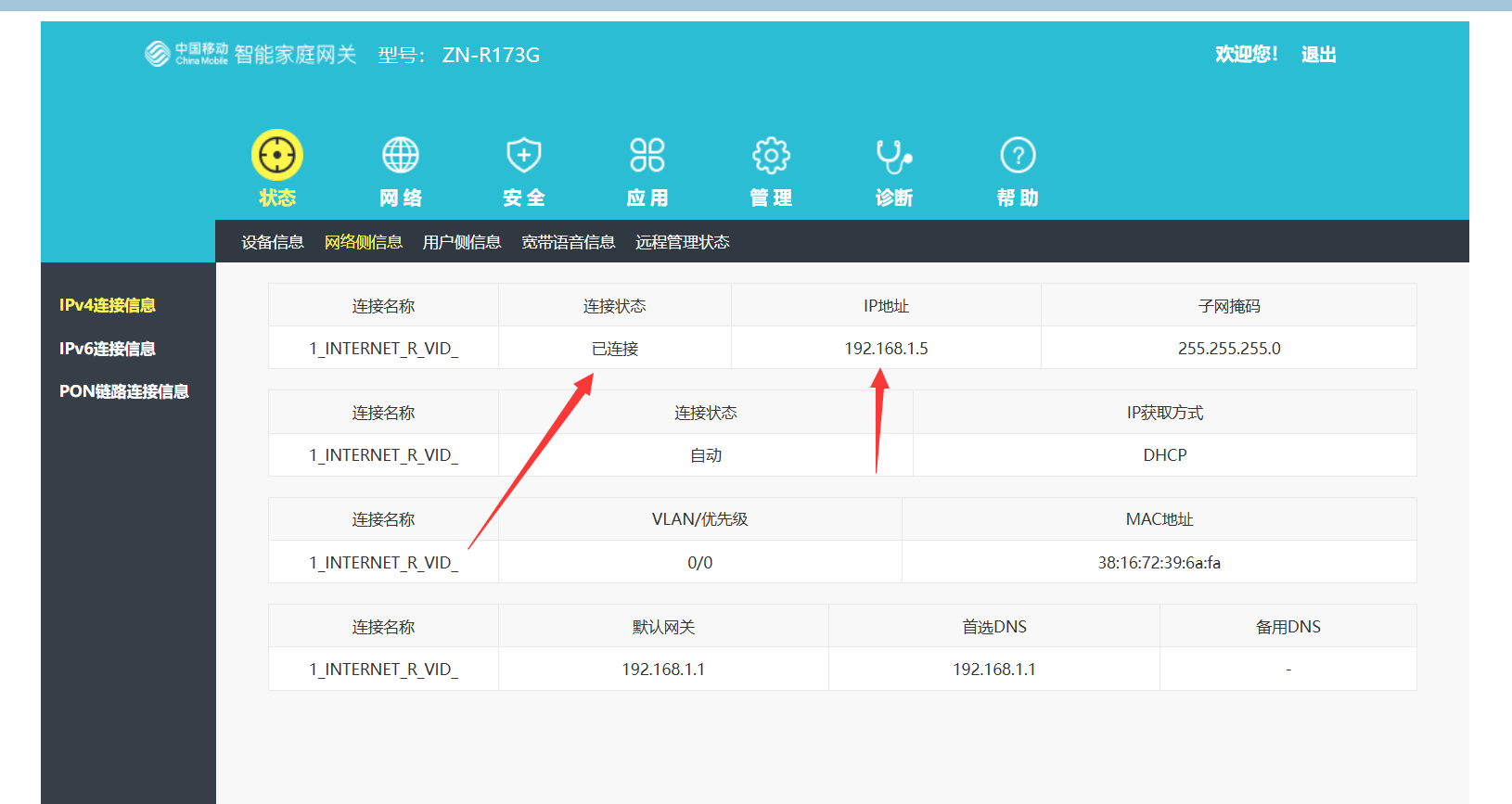 注意,设置三方光猫系统配置需要管理员账号密码,这里不讨论。我这里是ZN-AX173G型号为例子, 连接子光猫了之后,在这里可以看见信号强度,接受光必须在-8到-25中间。
