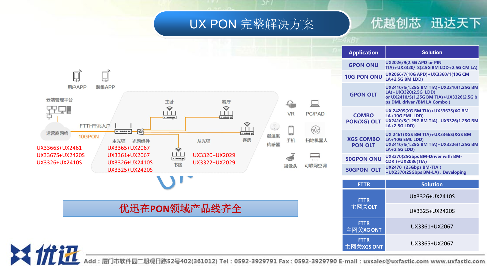 目前FTTR的子光猫光信号是GPON协议(为什么不是其他,因为目前初期GPON对家庭够了,节省成本,不用XGPON),未来会有XGPON吗,肯定会到来,那为什么呢?目前华为F50 FTTR上使用了一颗OLT类型的光电转换芯片UX3326,通过搜索资料(PowerPoint 演示文稿)可以发现如下信息,技术上没有问题。