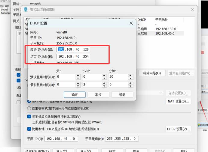 再选择下面的DHCP就可以看到对应的ip地址了,从下面的图形可以看出ip地址范围是128到254之间,这个范围随便写一个就行了的