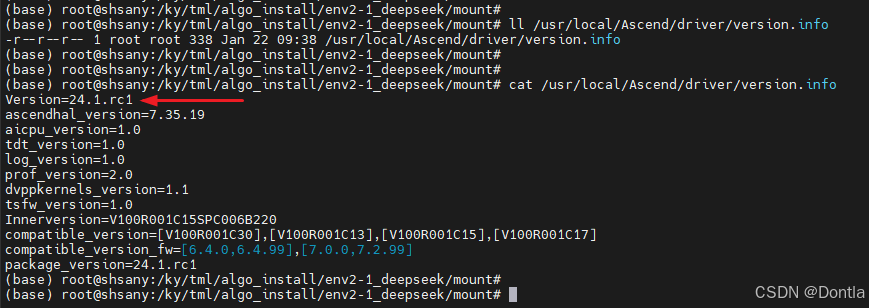 若已配置CANN环境变量(如source set_env.sh),可检查环境变量指向的安装路径中的版本文件,例如: