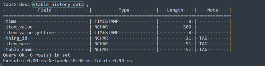 5. 通常情况下,一个采集点会对应存放在一张子表中。但在需要按设备或工段进行集中管理时,也可以采用多列模型:先手动创建包含多字段的超级表,将多个点位的数据按字段写入同一张宽表,实现更紧凑的建模方式。