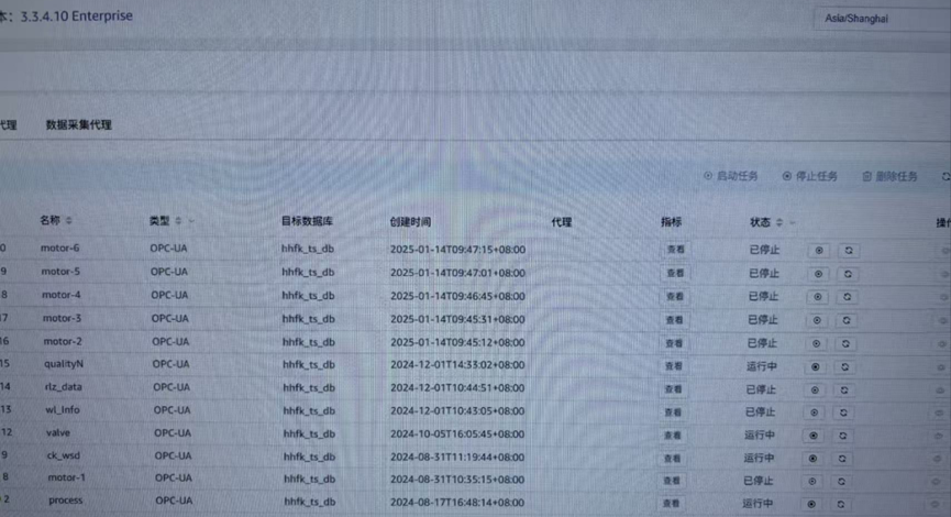 复烤厂的数据写入由 taosX 通过 OPC UA 方式完成,采集模式采用 observe,以秒级频率定时拉取。但在实际运行中我们发现部分点位存在数据缺失。排查后定位到 task.id:8:该任务一次性配置了超过 1 万个点位,负载过高,导致采集不稳定。我们将其拆分为 6 个任务,每个任务约 2000 个点位,显著降低单任务压力。同时将每个任务的 batchSize 从 10000 调整为 1000,以减少批处理延迟并提升采集成功率。